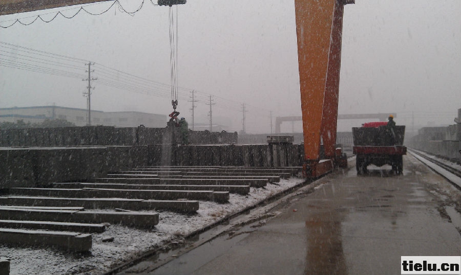 图为12月29日工人冒着风雪,进行管片堆放工作。(作者:彭丽霞 中铁二十三局轨道交通公司((无锡公司)