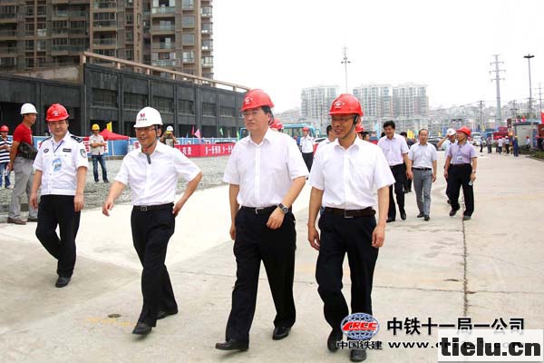 武汉市副市长张光清在中铁十一局副总经理刘华军的陪同下进入演练观摩区