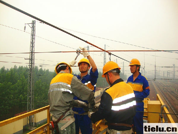 在安全大检查活动中,洛阳供电段党委各基层党总支抽调业务骨干成立党员突击队,充分利用“天窗修”时机,对管内接触网设备进行精检细修,全面提升设备质量。图为该段职工正在对接触网设备进行检修养护作业。(马睿 李小峰)