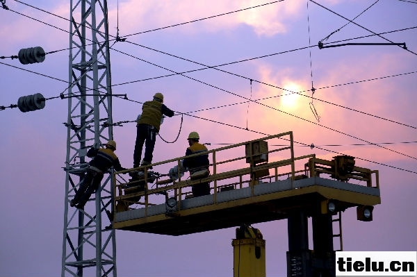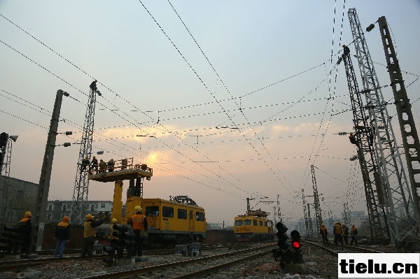 近日,郑州供电段调集80余名干部职工,6台接触网作业车,在郑州北站下发场进行接触网改迁施工,确保黄河路涵洞下穿市政工程顺利进行。图为12月3日,该段职工正在施工现场进行标准化作业。