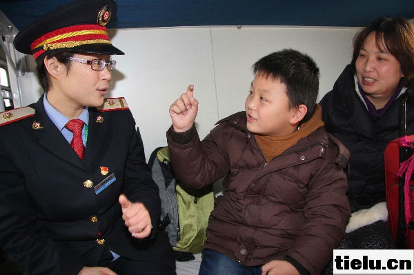 2014年春运期间,郑州客运段围绕总公司提出的“安全出行、方便出行、温馨出行”春运总目标,将服务工作进一步落到细节,干到实处,努力为旅客营造舒适温馨的旅行环境。图为深圳车队列车长张媛媛与旅客交谈时的情景