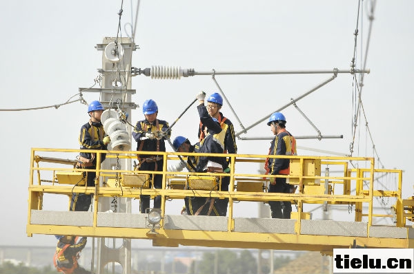 近日,西宁供电段利用天窗计划,对管内包西线接触网供电线路精简细修,全面消除各类隐患,确保暑运期间供电设备良好。图为:该段响沙湾供电车间接触网工在罕台川北至罕台川区间调整补偿装置滑轮间距。