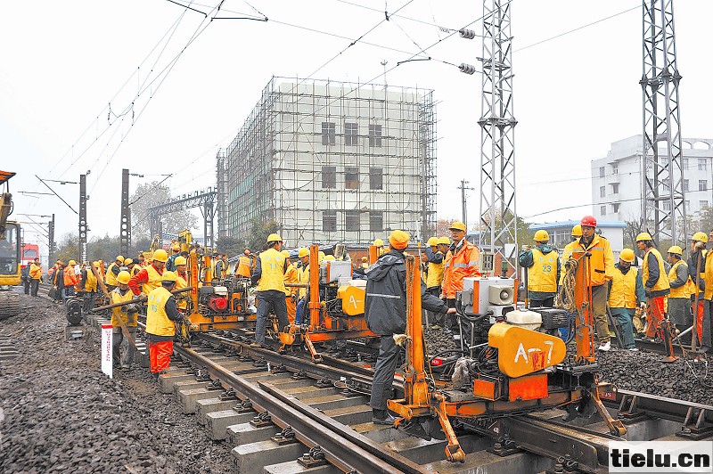 为提高线路质量,连日来,襄阳工务段加快推进襄阳北站道岔升级改造,确保早日恢复运输秩序。图为该段职工在进行道岔轨排推移作业。 李锋 摄