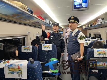 图3为10月1日8:44,G1590次列车长会同乘警巡视宣传祝旅客国庆快乐并温情提示节日出行安全注意事项。