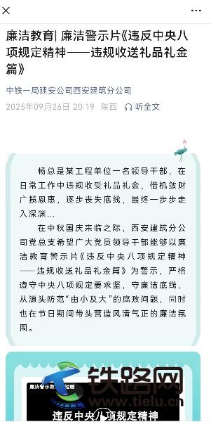 (西安讯)随着中秋、国庆双节的来临,为持续强化作风建设,严明节日期间纪律规矩,自9月26日以来,中铁一局建安公司西安建筑分公司党总支积极通过“教”,“文”,“查”,“谈”等多种方式并举,打好节前“组合拳”,严把双节“廉洁关”,持续践行学习教育要求。
