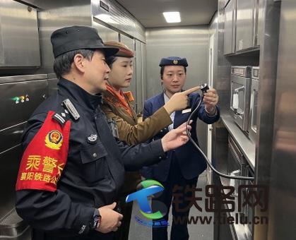 图3为11月4日9:34,G1528次列车乘警联合列车长、餐服长检查餐车用电器工作状态及注意事项。