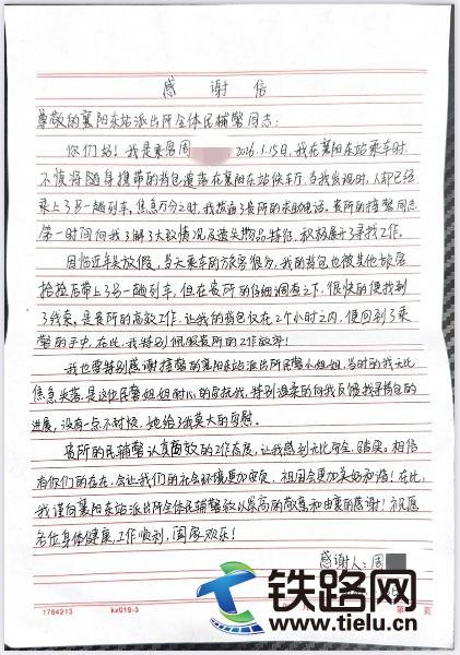 从报警到找到背包不到两个小时,周女士连声道谢“太感谢了,你们真是人民的好警察12026年1月17日,襄阳东站派出所收到了一份特别的包裹,周女士和其先生亲手送来的感谢信和一面写着网络流行语的锦旗,“8个牛、靠谱、yyds”这些活泼的字句,承载着最真挚的谢意。