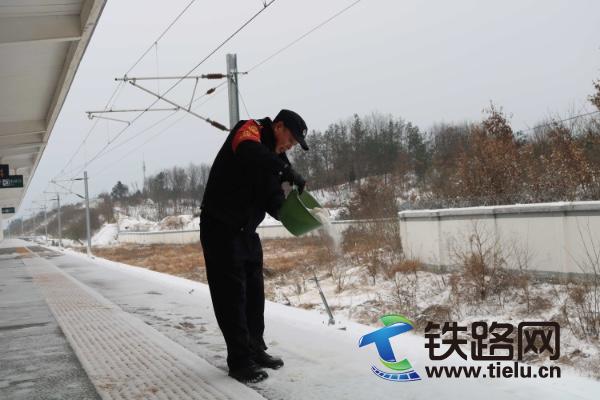 面对寒冷天气,随州南站派出所充分发挥党组织战斗堡垒作用,干部率先垂范,民警坚守一线,会同车站工作人员,携带除雪工具,重点对旅客乘降必经的站台、通道等区域进行快速清理,及时铺设防滑垫、撒融雪剂、铲冰除雪,第一时间清出安全通道,有效避免了旅客滑倒摔伤等意外情况。