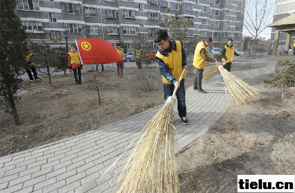 正值学雷锋活动开展51周年,呼和浩特铁路局团委组织局内65名青年志愿者开展 “3.5奉献日”活动,集中深入包头地区铁路居民小区、站前广场、汽车乘车站等地点清理整治环境卫生,为周边市民营造了一个干净整洁的生活环境。图为青年志愿者在居民小区帮助清理环境卫生。