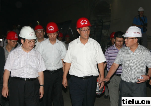 图片说明:中国铁路总公司副总经理卢春房(前右二)在晋豫鲁通道公司董事长、总经理汤晓光(前左二),十八局集团党委书记宋占波(前左一)、中南部铁路通道常务副经理张晓华(前右一)等陪同下现场办公(伍振陈维德摄)
