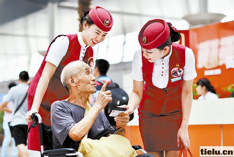 针对暑运末期客流不断增加的实际,天津站高铁玫瑰服务组成员在候车大厅为旅客送上温馨服务,让旅客在旅途中感受到轻松快乐。8月28日,高铁玫瑰服务组成员在服务重点旅客。 杨宝森 摄